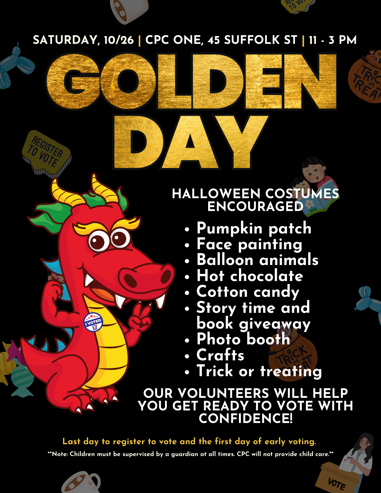 The month will culminate in a Golden Day Festival, a free family day on 10/26 at CPC One that will bring the community together around voting, culture, and fun.