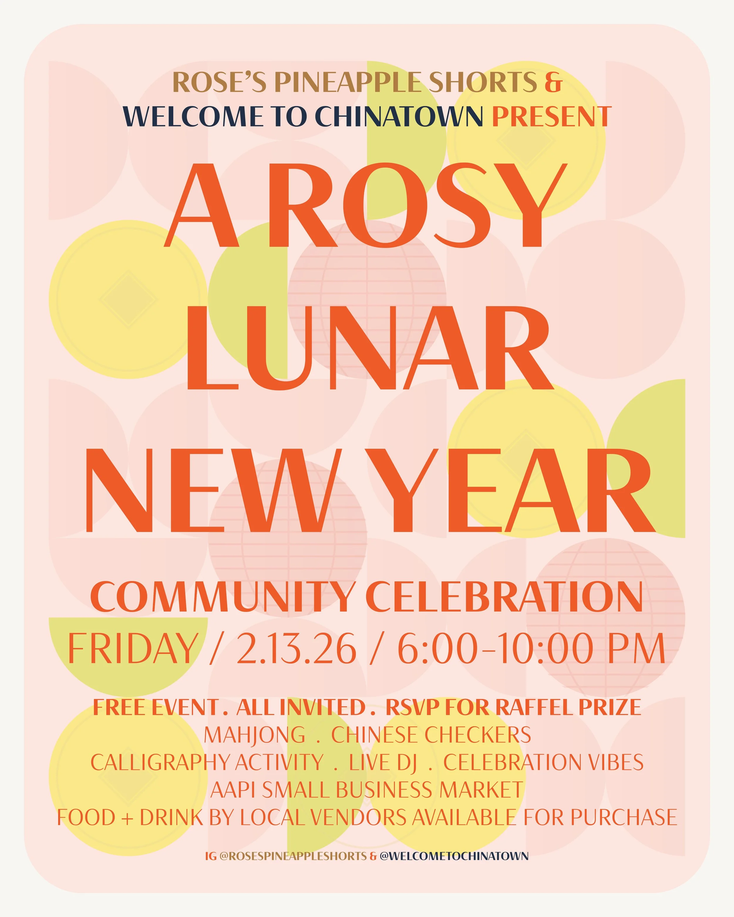 Rosy Lunar New Year is Rose's Pineapple Shorts's annual Lunar New Year party, a free event to bring community together to celebrate AAPI culture with friends and family, food and fun. This year, we are excited to be partnering with Welcome to Chinatown to offer our biggest event yet!