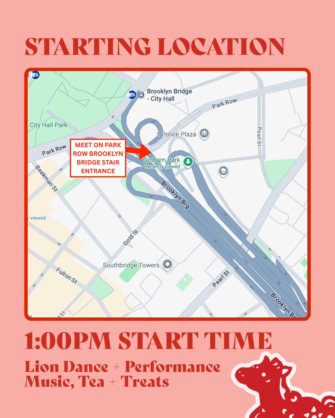 We’ll have tea and treats courtesy of Open Plans (while supplies last!). After the performance, we’ll take a joyful stroll down Park Row to join Chinatown’s Super Saturday celebrations.