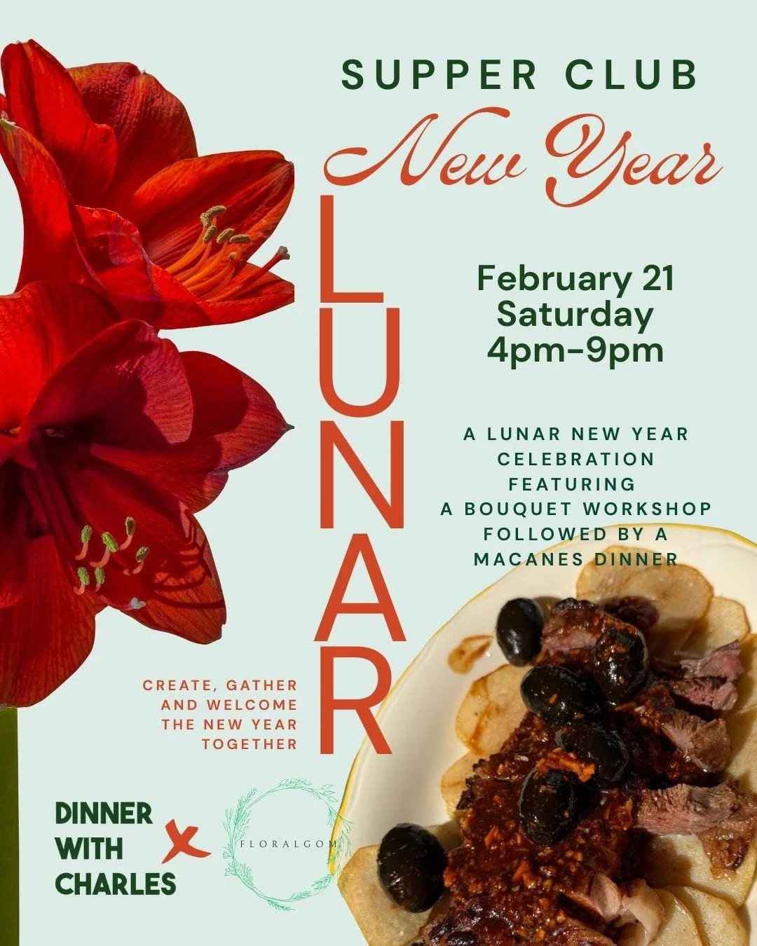 FLORALGOM and Dinner with Charles invite you to a two-part Lunar New Year experience. Begin with a guided bouquet workshop, exploring seasonal stems and FLORALGOM’s signature style.