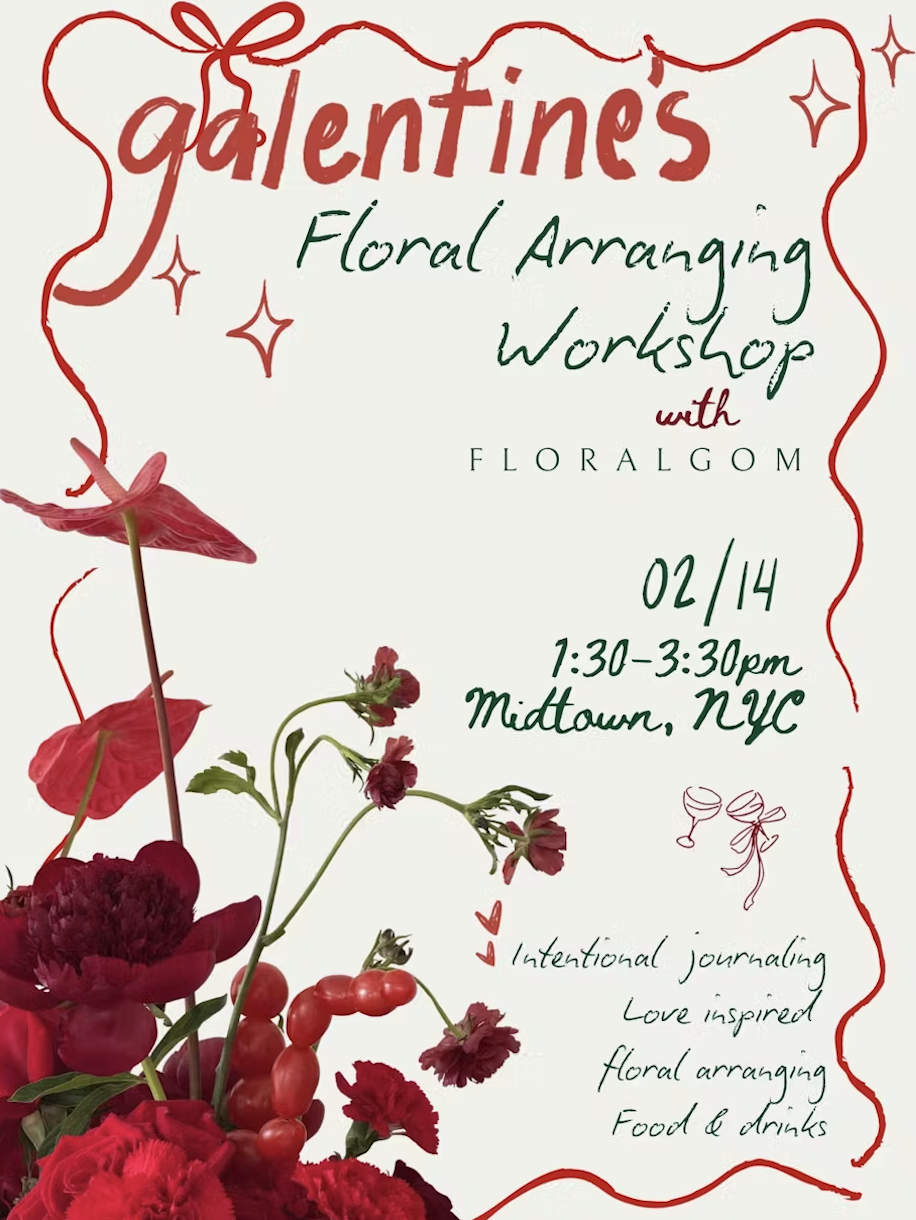 A gentle Galentine’s gathering centered on friendship, self-love, and slowing down together. Join us for guided floral arranging paired with mindful journaling and reflection as we welcome the new year with intention. Come with a friend or come solo- this space is about connection, not perfection. Come hungry for connection- Sushi and 1 cocktail/mocktail included.