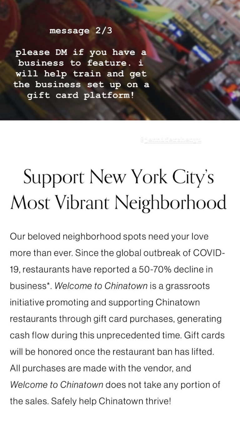 Welcome to Chinatown was founded in March 2020 as a grassroots initiative by Jennifer Tam and Vic Lee, two Asian American women with a deep love for Manhattan’s Chinatown. Both Jennifer and Vic were long time residents of Chinatown, with Jennifer moving from Houston to Chinatown after college and Vic spending every Sunday at her late grandmother’s apartment on 135 Eldridge Street until she moved to Chinatown during college.
